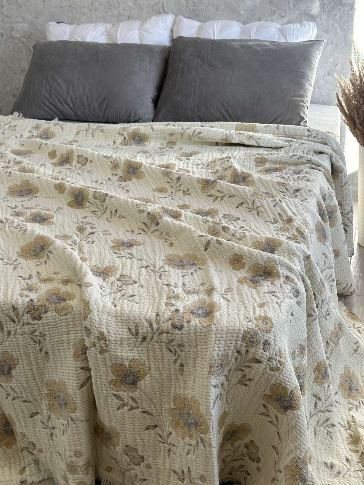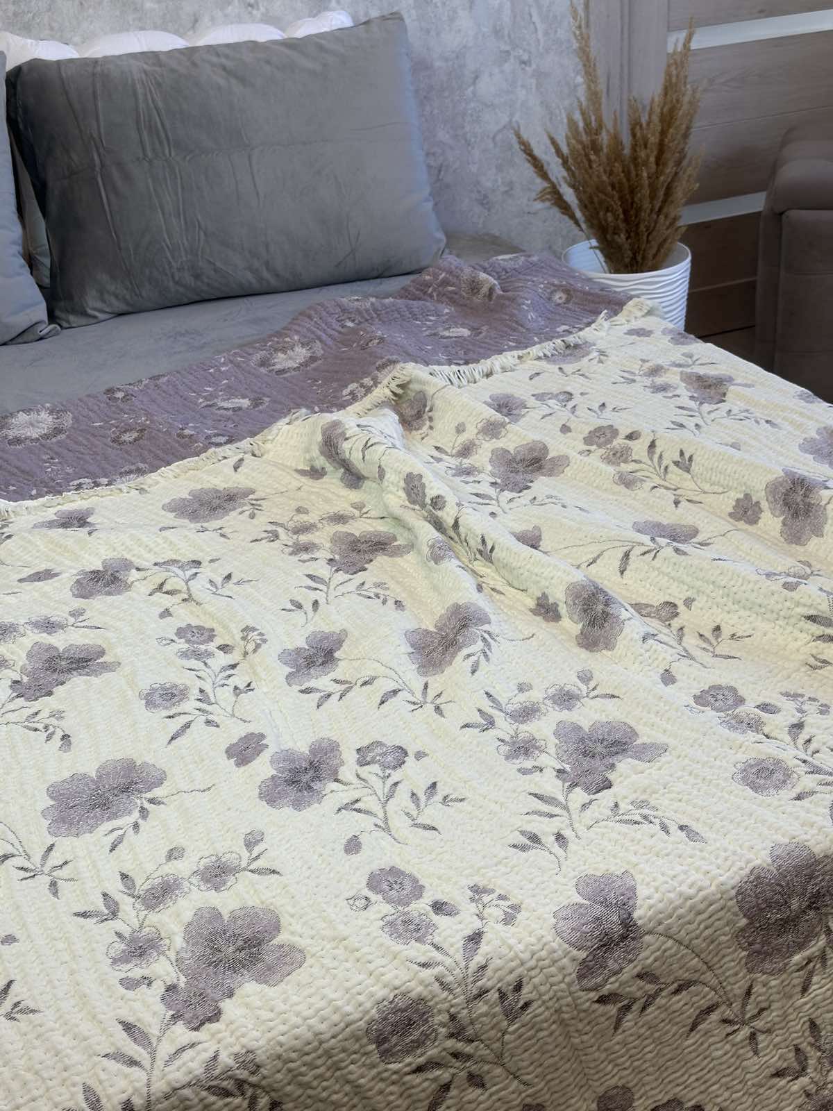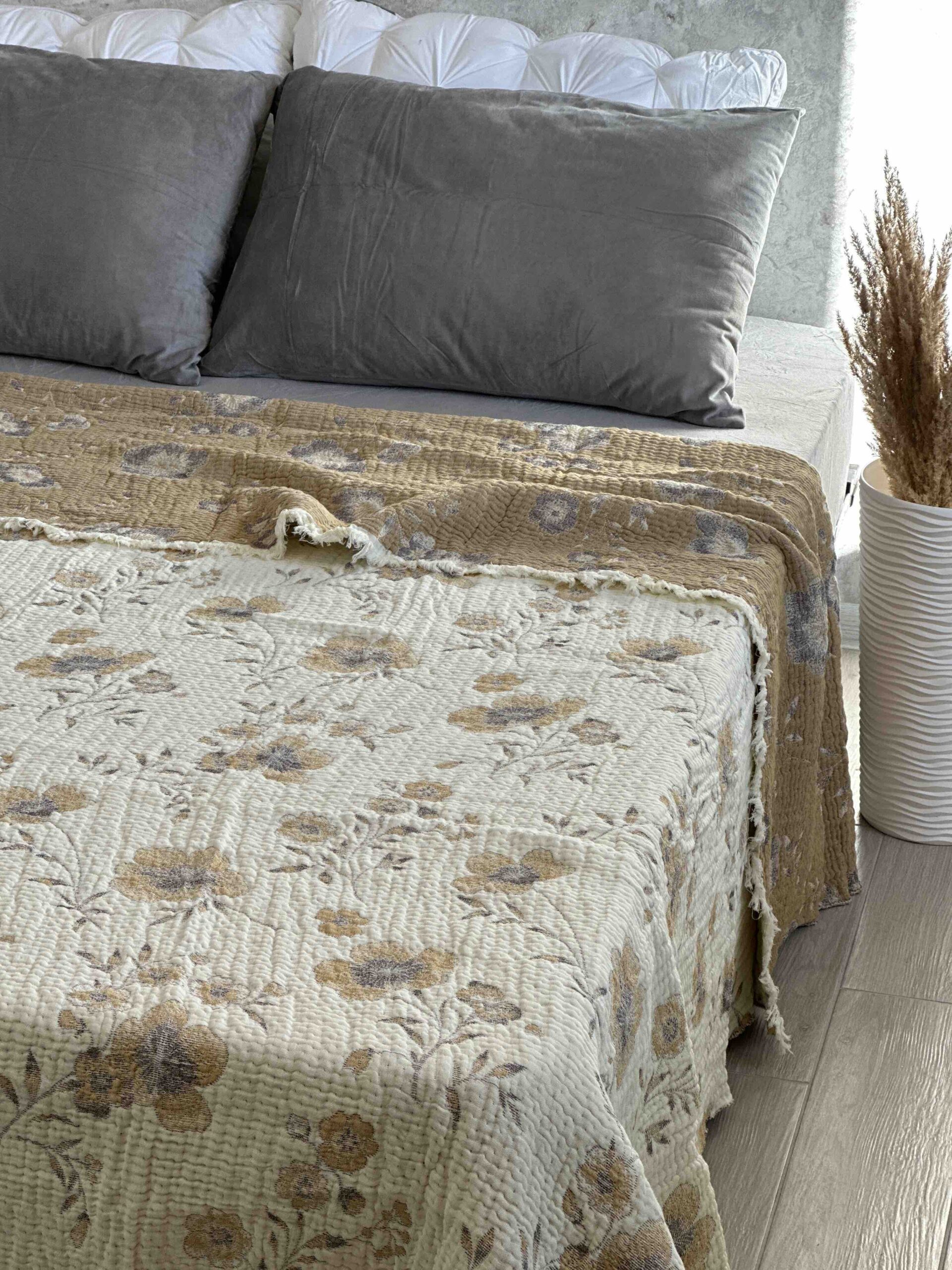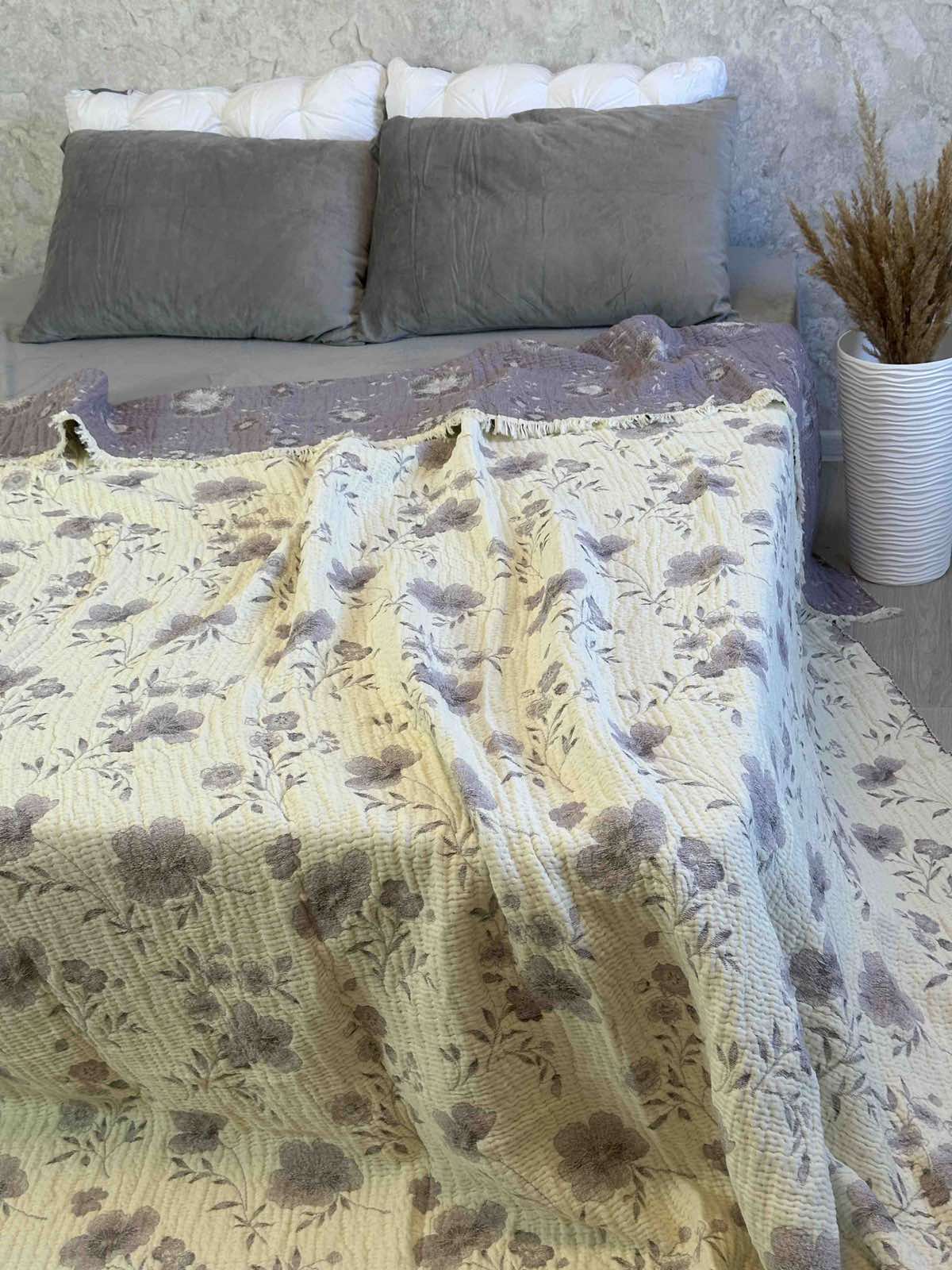 Ніжне двостороннє муслінове покривало з квітковим візерунком у спокійних природних відтінках. Молочно-кремова, основа прикрашена великими стилізованими квітами та гілочками у теплих бежево-лілових тонах.