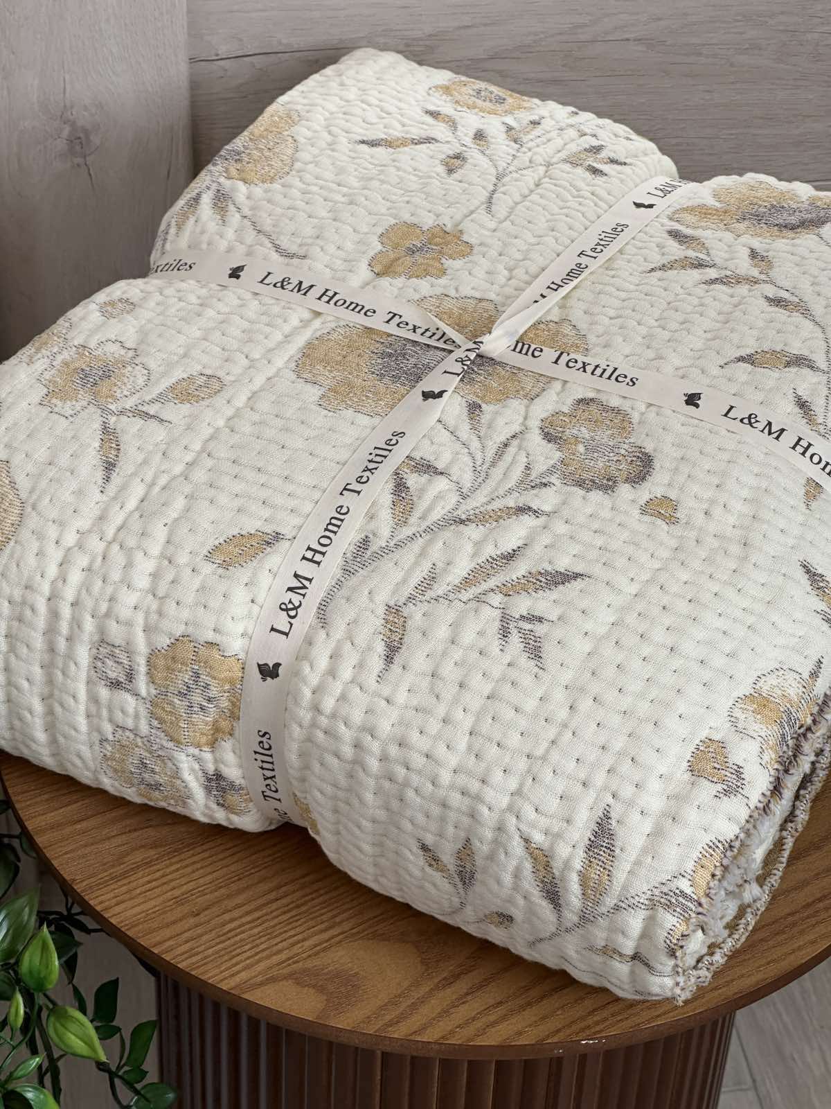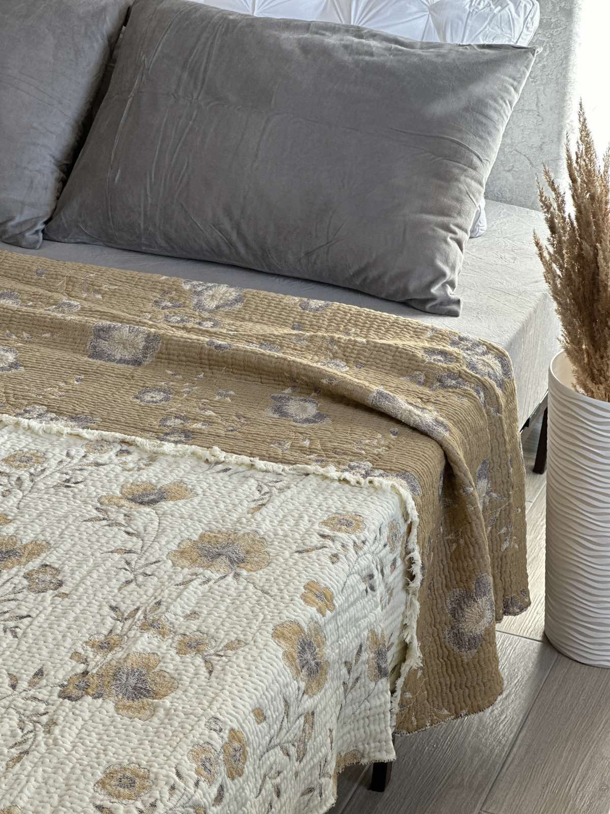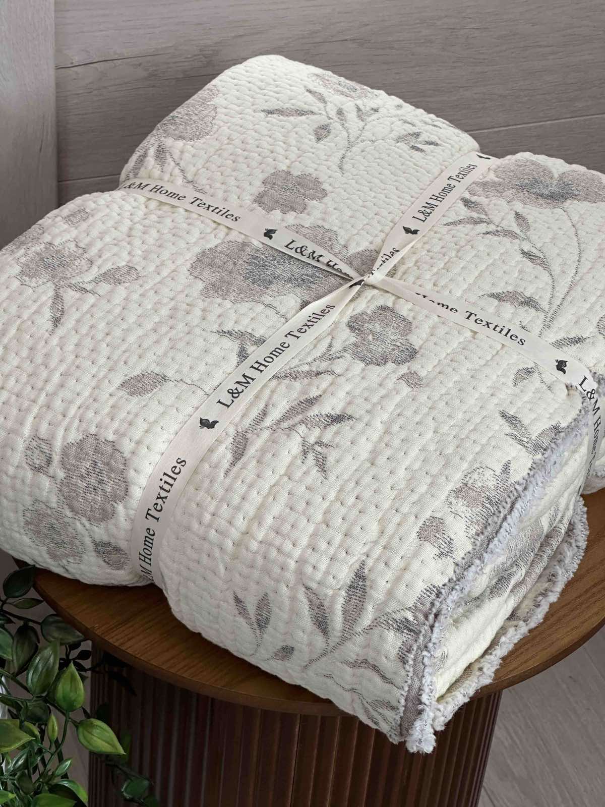Ніжне двостороннє муслінове покривало з квітковим візерунком у спокійних природних відтінках. Молочно-кремова, основа прикрашена великими стилізованими квітами та гілочками у теплих бежево-лілових тонах.