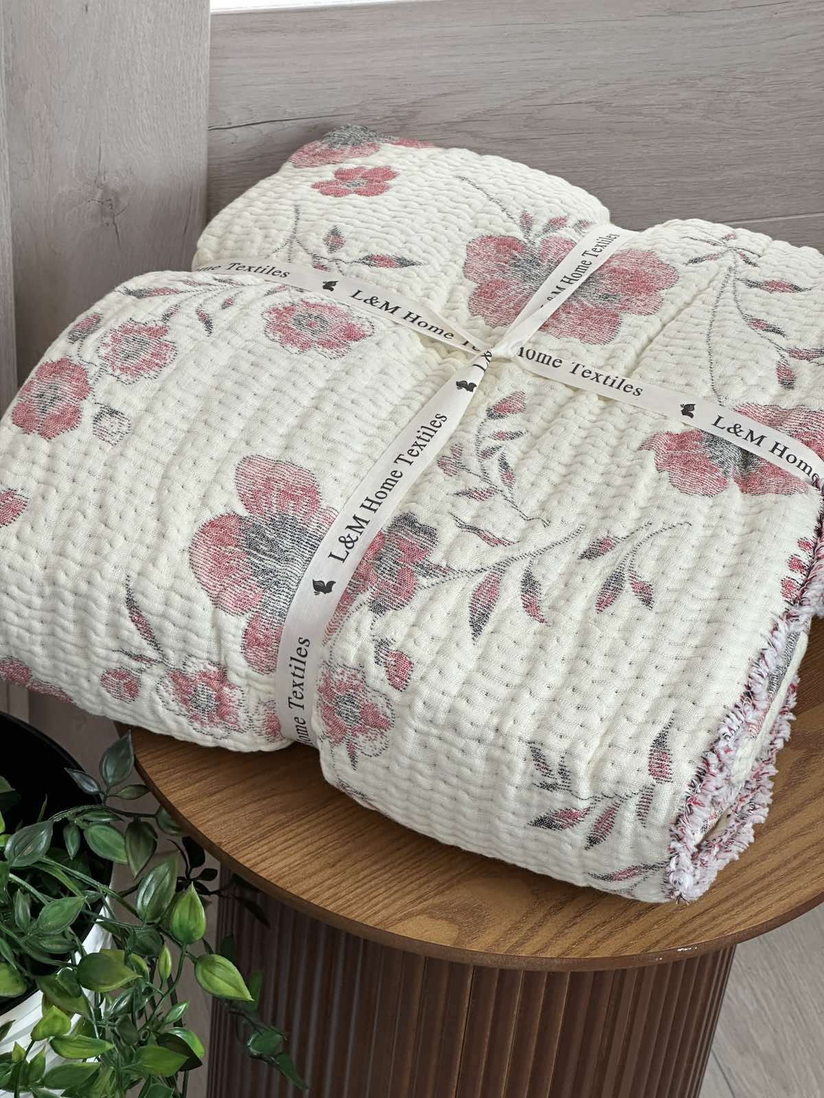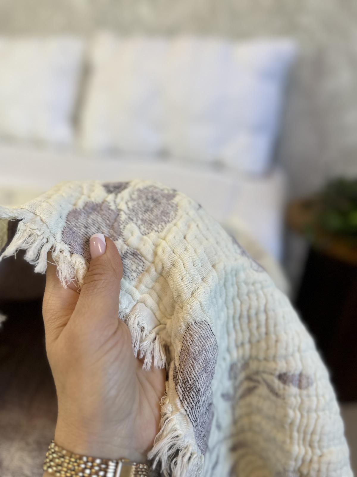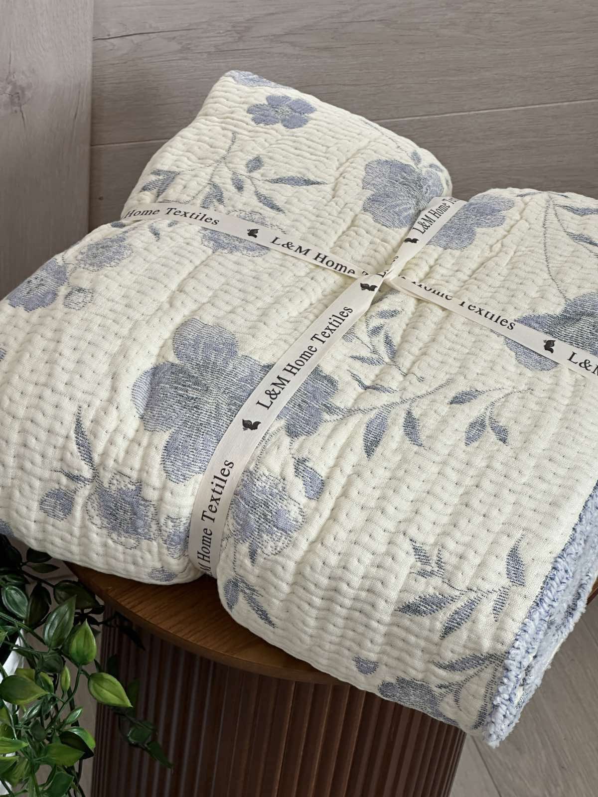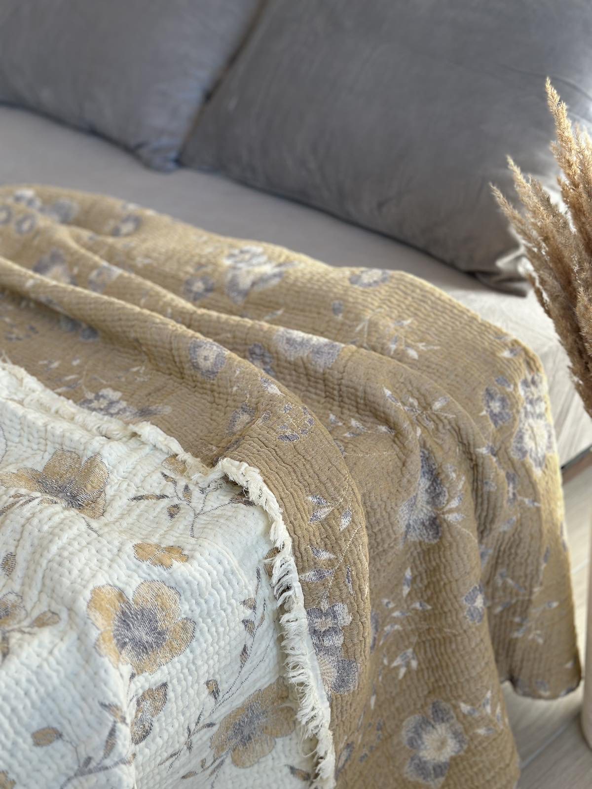Ніжне двостороннє муслінове покривало з квітковим візерунком у спокійних природних відтінках. Молочно-кремова, основа прикрашена великими стилізованими квітами та гілочками у теплих бежево-лілових тонах.