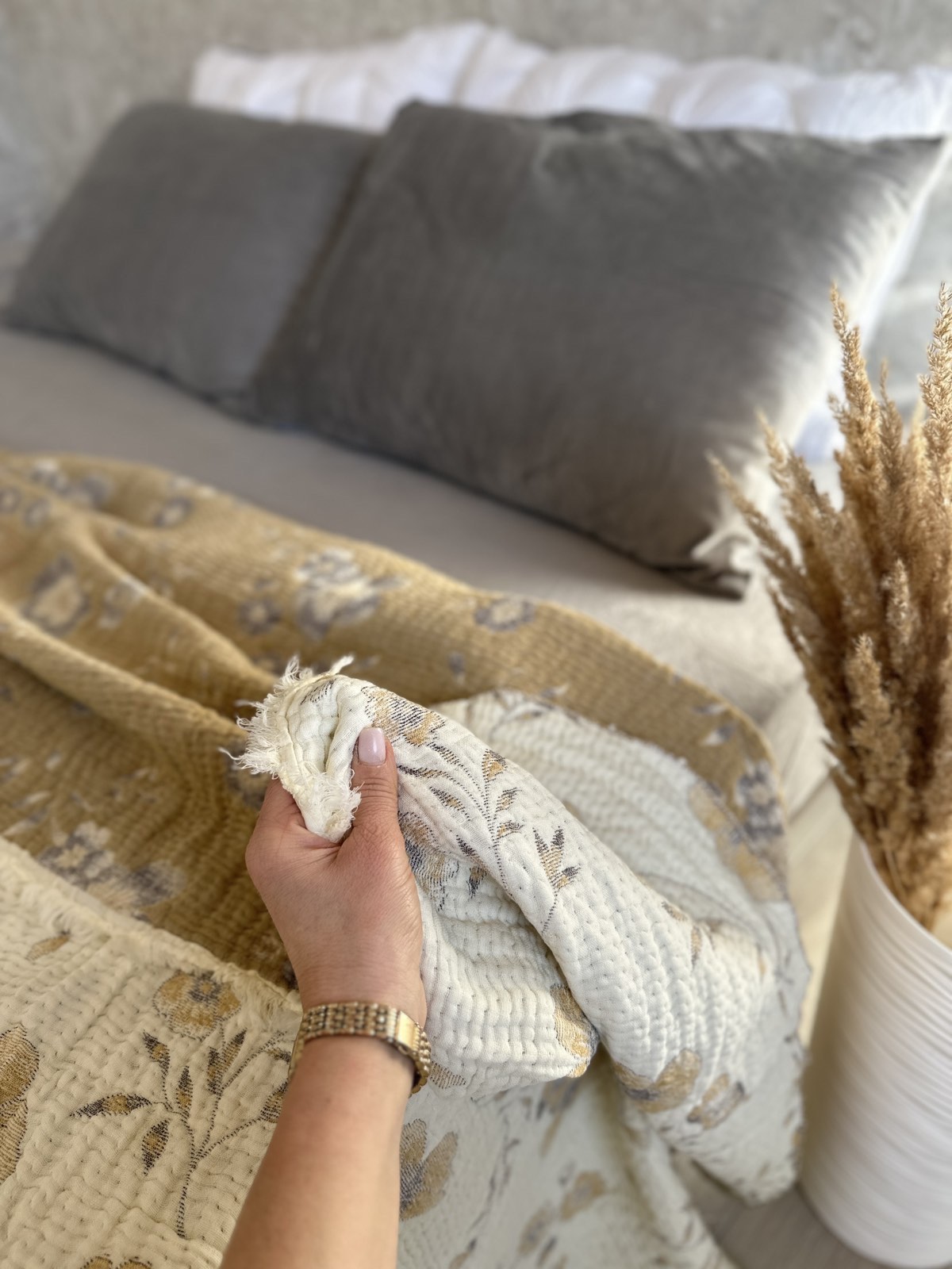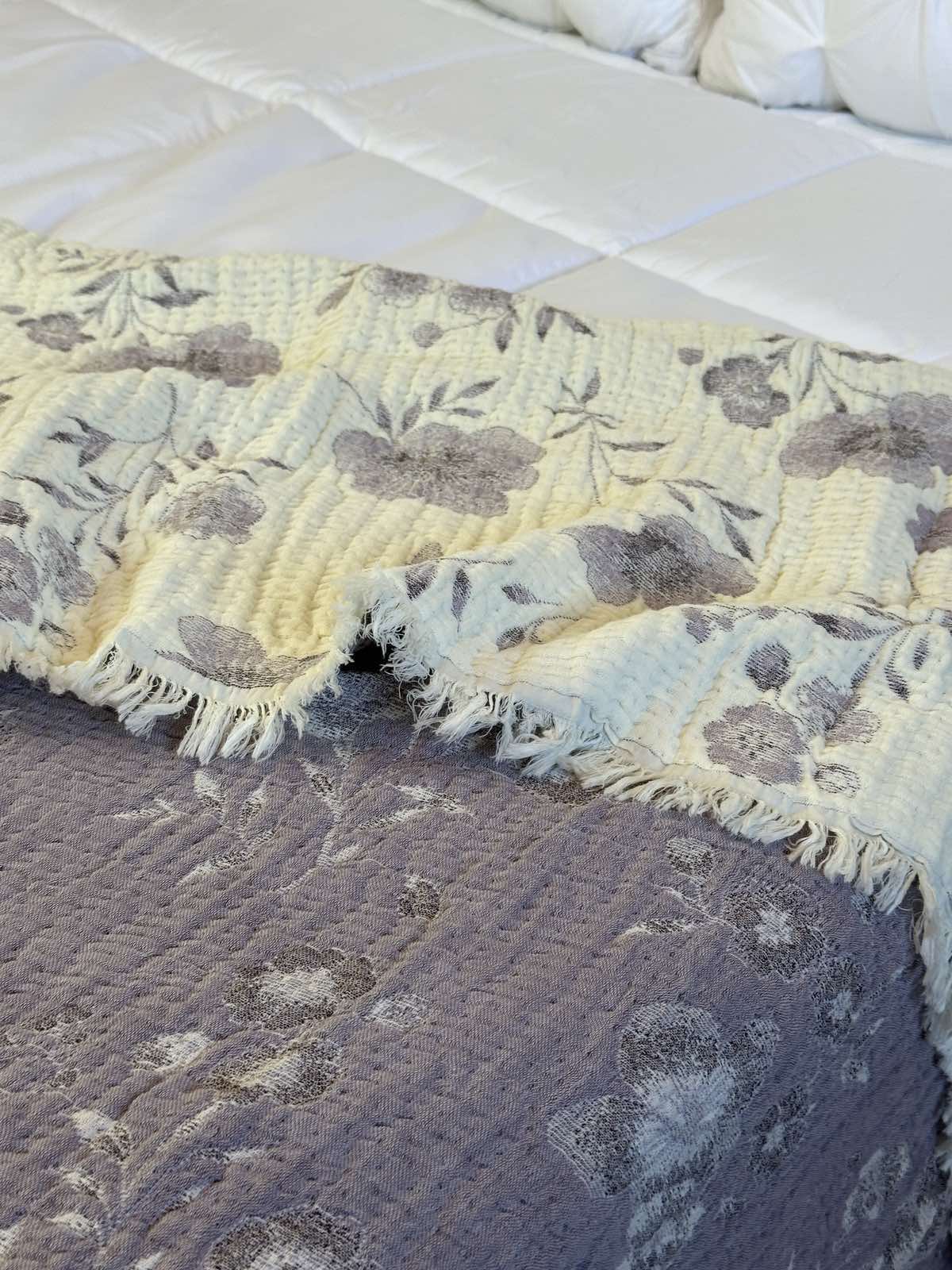 Покривало дуже м’яке, повітряне і приємне на дотик. Воно гармонійно поєднується з нейтральним інтер’єром — світлою постіллю, сірими подушками та натуральними акцентами. Ідеально підійде для спальні у стилі прованс, скандинавському або сучасному мінімалізмі, створюючи атмосферу тепла та затишку.